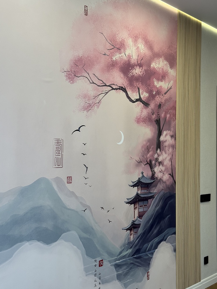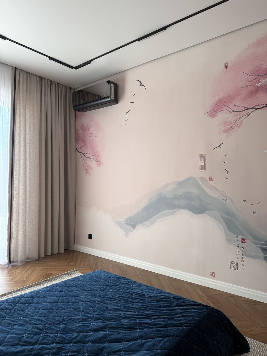 В соседней комнате раскрывается другая грань красоты - японский пейзаж с изящными силуэтами гор, с его спокойствием и глубиной, который приглашает к созерцанию. Получилось пространство, где каждый может найти свой собственный дзен – будь то в нежном цветочном очаровании или в безмолвном величии природы!