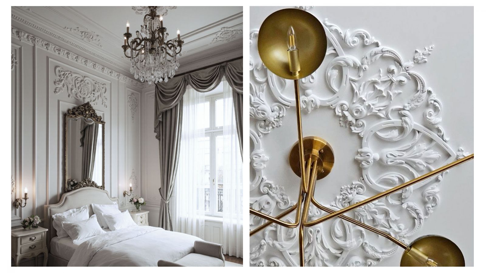 Потолок в современном французском стиле достаточно прост. Он окрашен в светлую, зачастую белую краску. Чтобы избежать однообразия и добавить некий шик, потолок оформляется гипсовой лепниной, иногда деревянными балками с отсылкой к стилю прованс.