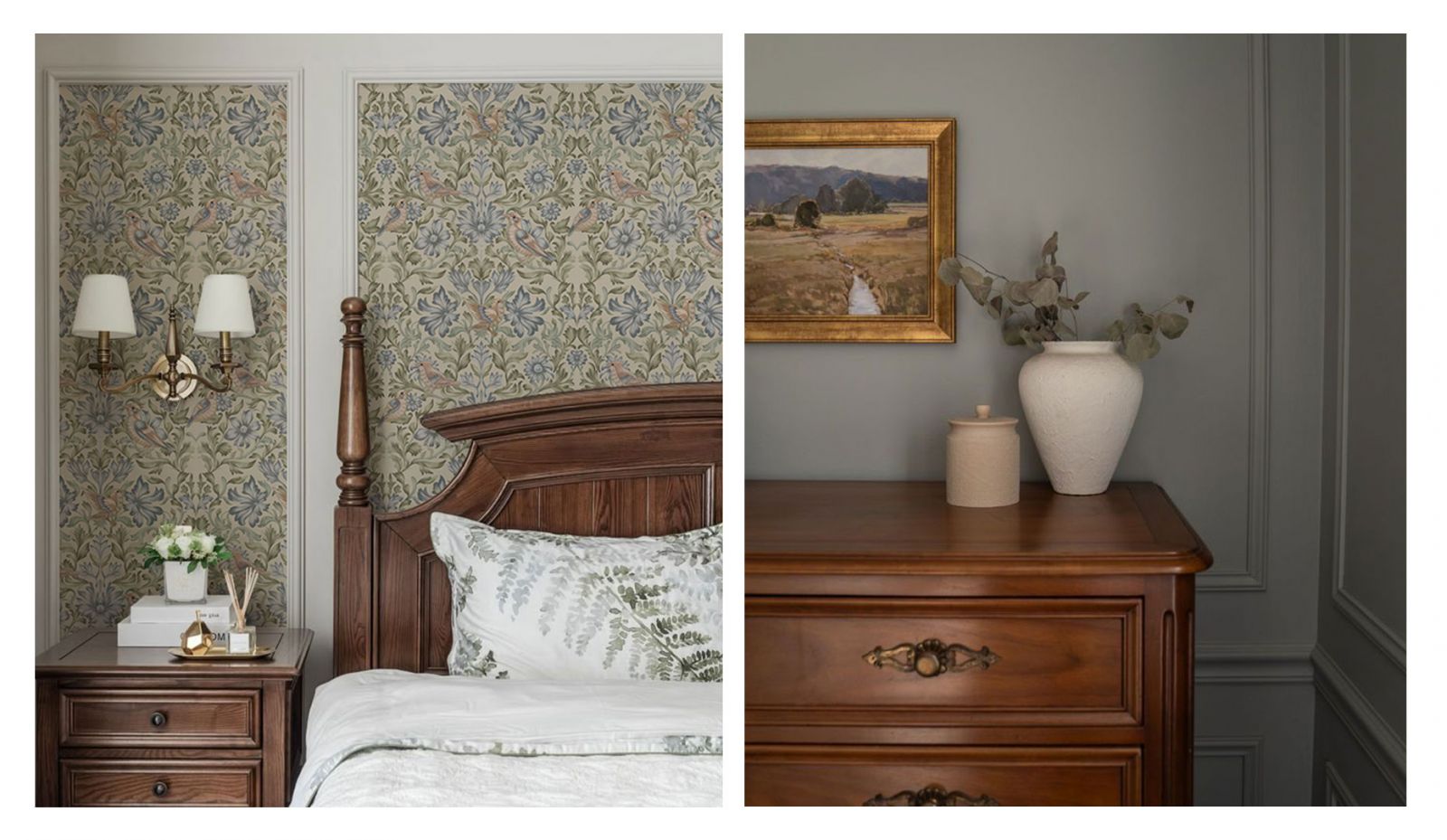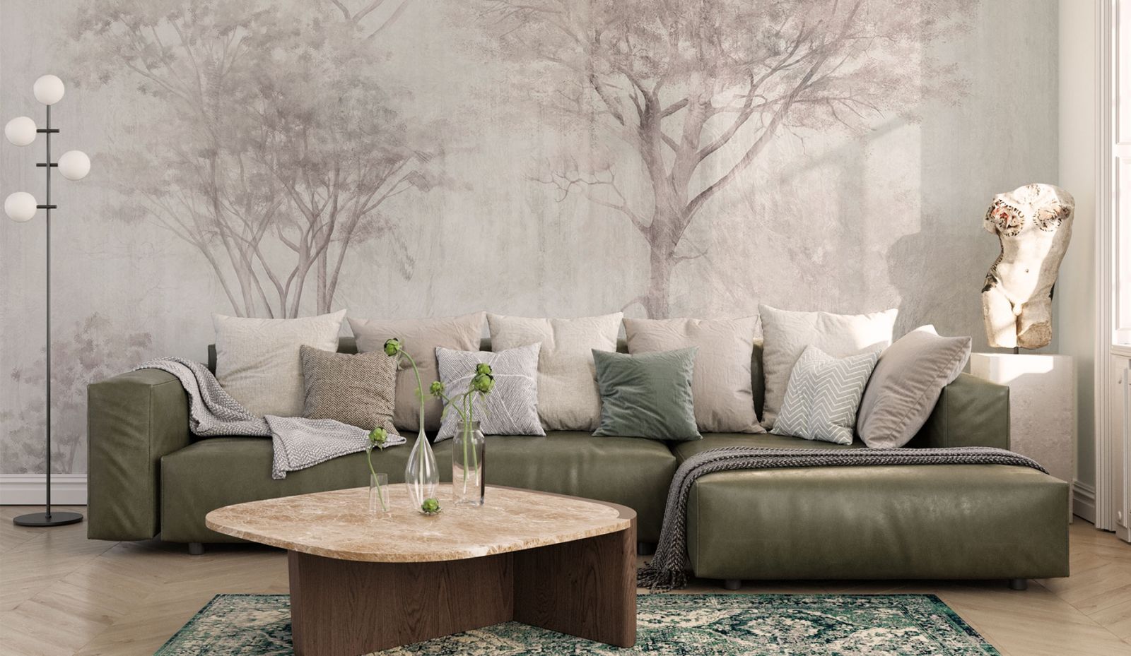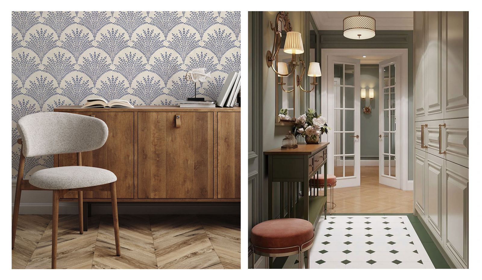 Как правило, стены в переходном стиле являются лёгким ненавязчивым фоном. Из материалов предпочтение отдаётся фактурной штукатурке, декоративному кирпичу с эффектом натуральной кладки, деревянным панелям. Чтобы привнести ту самую индивидуальность и изюминку в переходный интерьер, отличным выбором станут обои с лёгким ненавязчивым сюжетом. Гармоничные цветовые вариации, дизайнерские сюжеты на любую тематику (будь то классические узоры и вензеля или та же имитация природных текстур) позволят создать оригинальный акцент на определённой зоне вашего пространства, наполнят его смыслом и оригинальностью. К тому же, они максимально экологичны, подходят для размещения в спальнях и детских комнатах.